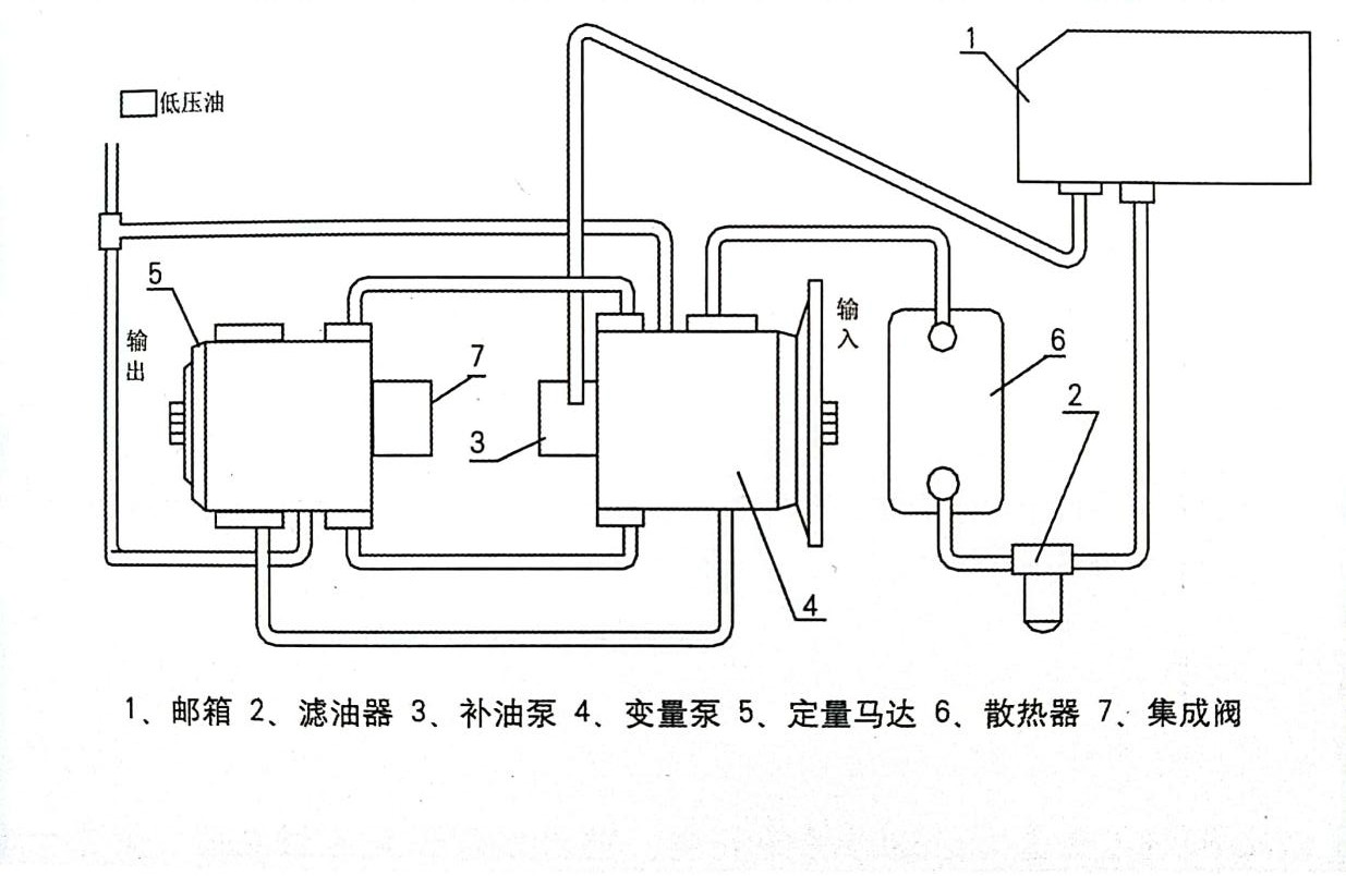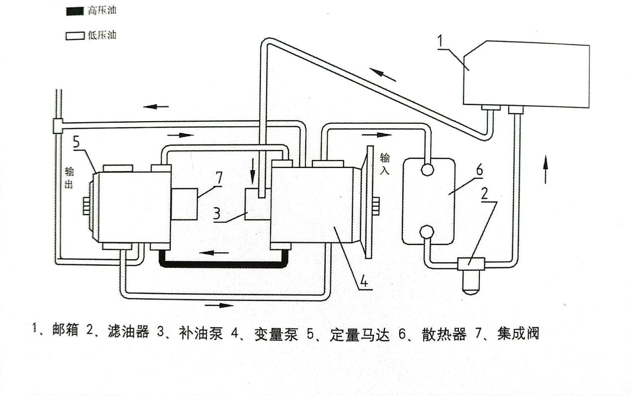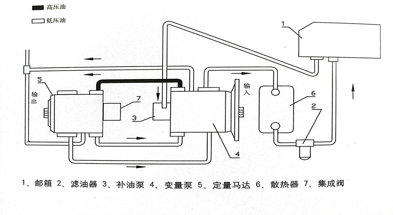 1. 軸向柱塞泵通過聯軸器與柴油機連接,軸向柱塞馬達與減速器的輸入軸聯接,動力由減速器從動軸輸出,經前后傳動軸、驅動橋,帶動車輪旋轉,使裝運機行走。當司機踩下前進或后退踏板時,通過機械連桿操縱,雙向排量控制閥桿向左、右兩個方向擺動,從而控制兩個伺服油缸,改變回轉斜盤的偏向和偏角。
